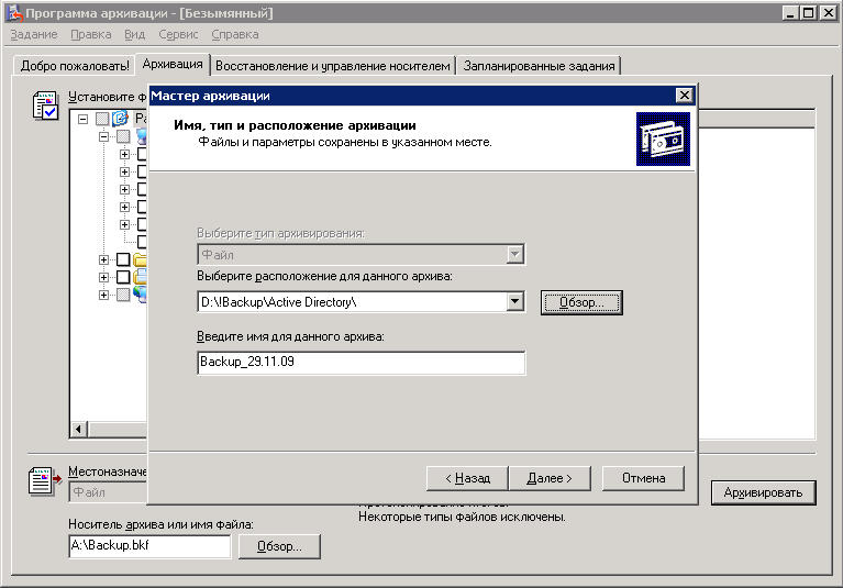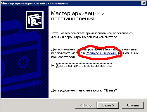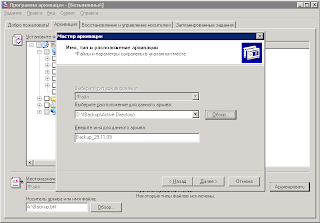 1) Запукскаем NTBACKUP.EXE из консоли, либо "Пуск\Все Программы\Стандартные\Служебные\Архивация данных"